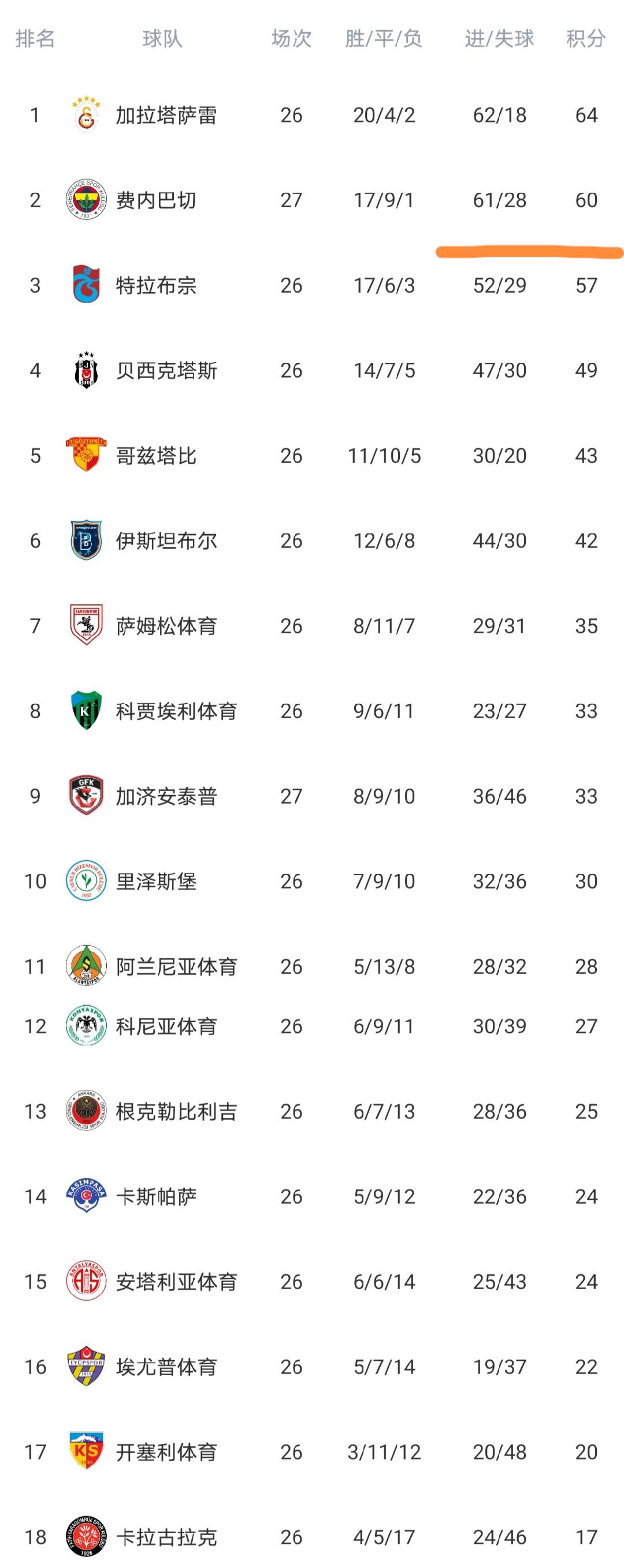 最终费内巴切大胜加济安泰普。赛后费内巴切队积60分继续排名第2,仅差榜首的加拉塔萨雷队4分。
